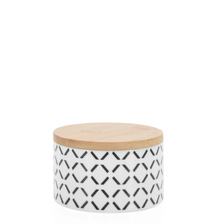 Mix and match sizes and patterns of these functional patterned porcelain canisters with bamboo lids. Perfect for kitchen countertops, bathrooms, or as a small storage container in any setting.