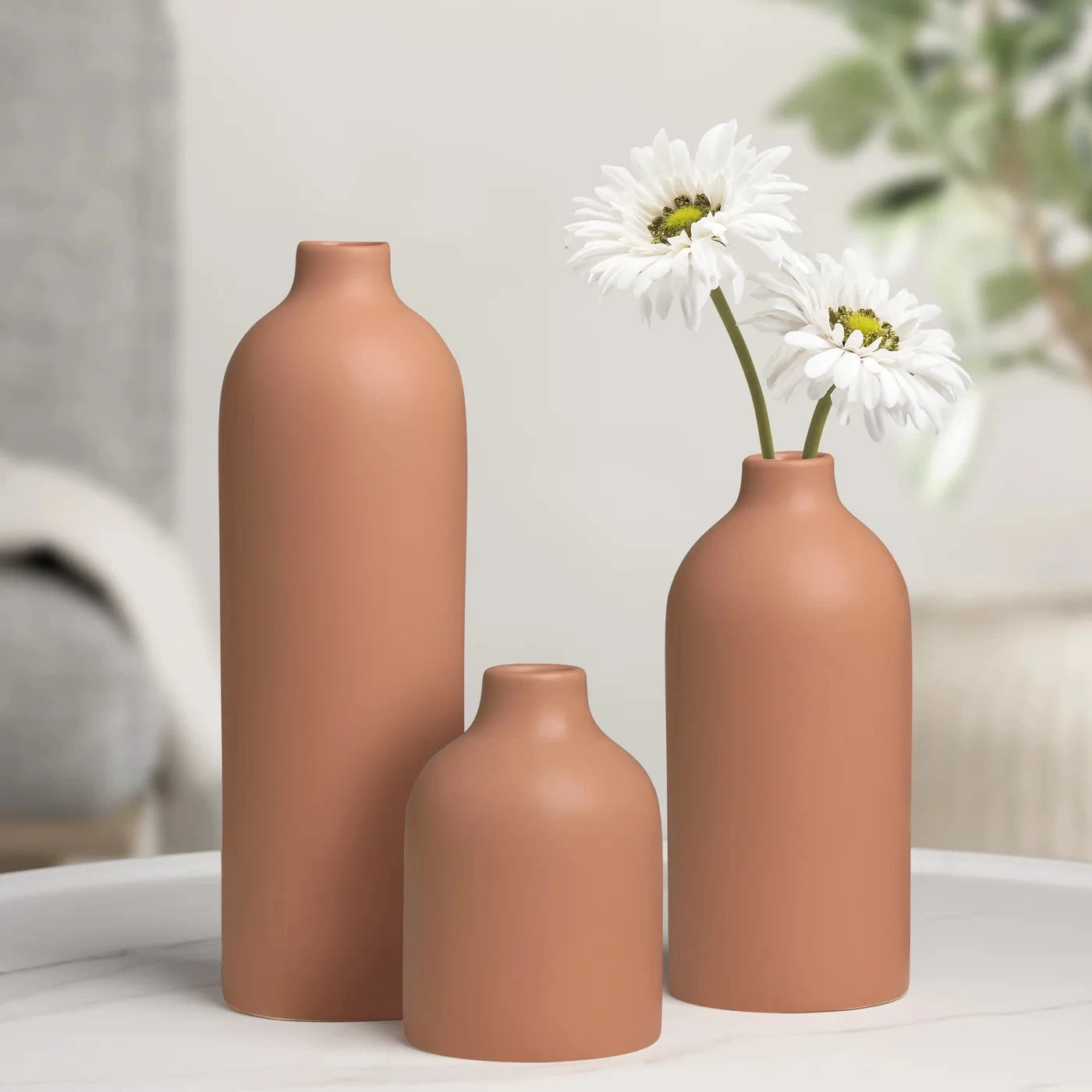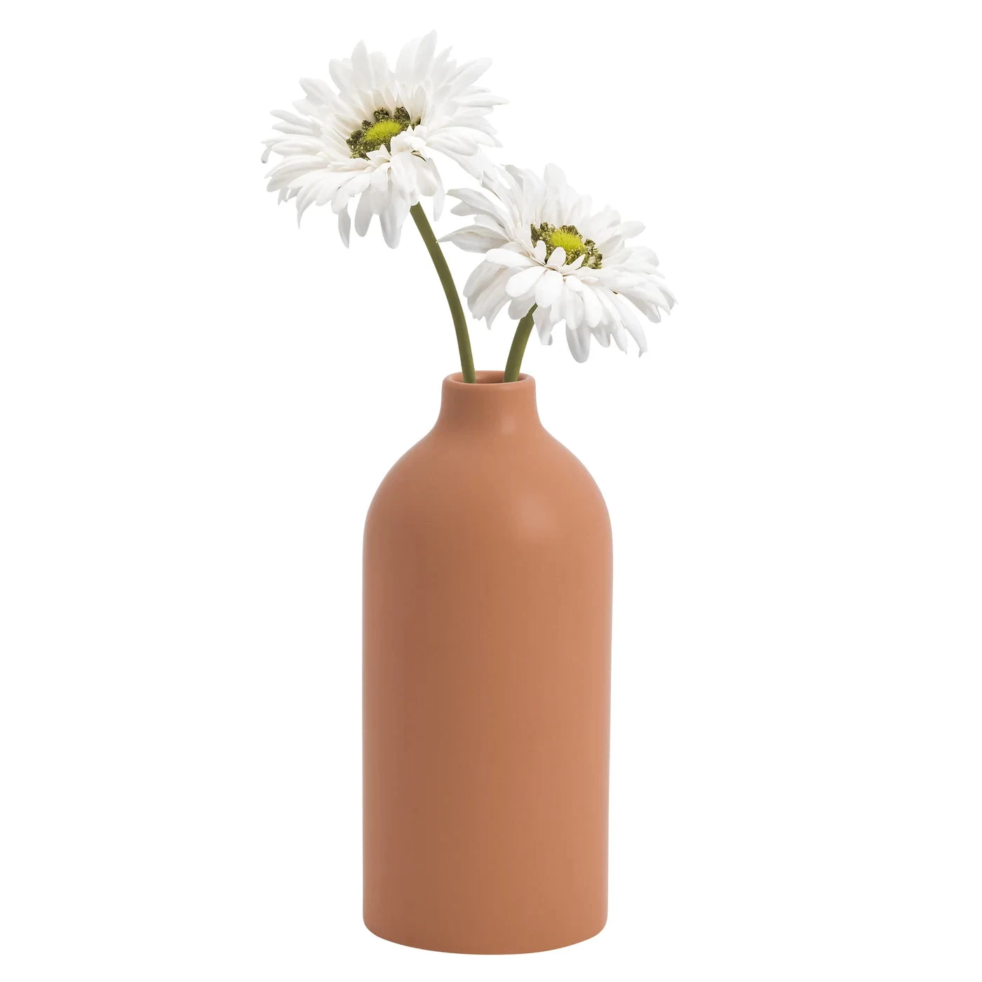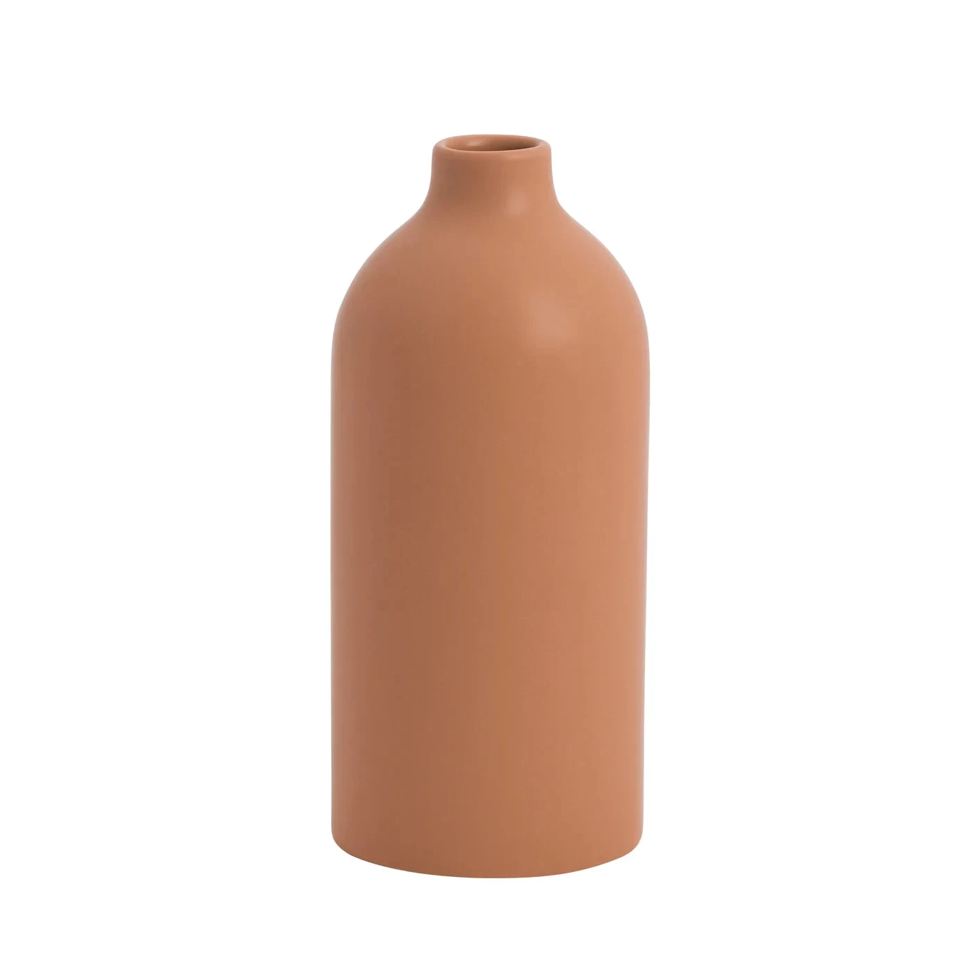 This Komi 8h” Ceramic Bottle Vase exudes a modern sophistication with its slim silhouette and matte terracotta finish. Its timeless design and versatile shape allow it to be used as a single statement or group of multiple pieces for a unique display. Use it to elevate the look of your shelves or mantel for an exclusive touch.