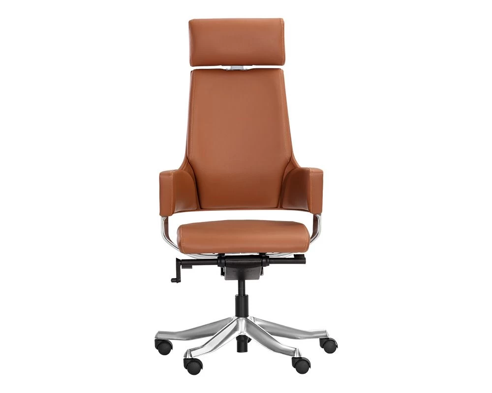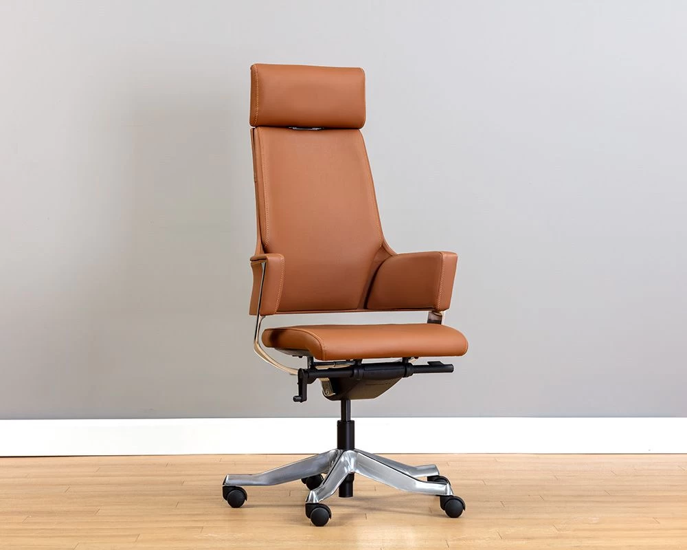 A modern office chair in with a tall seatback in black and tan faux leather. Features an adjustable seat and castors for mobility.