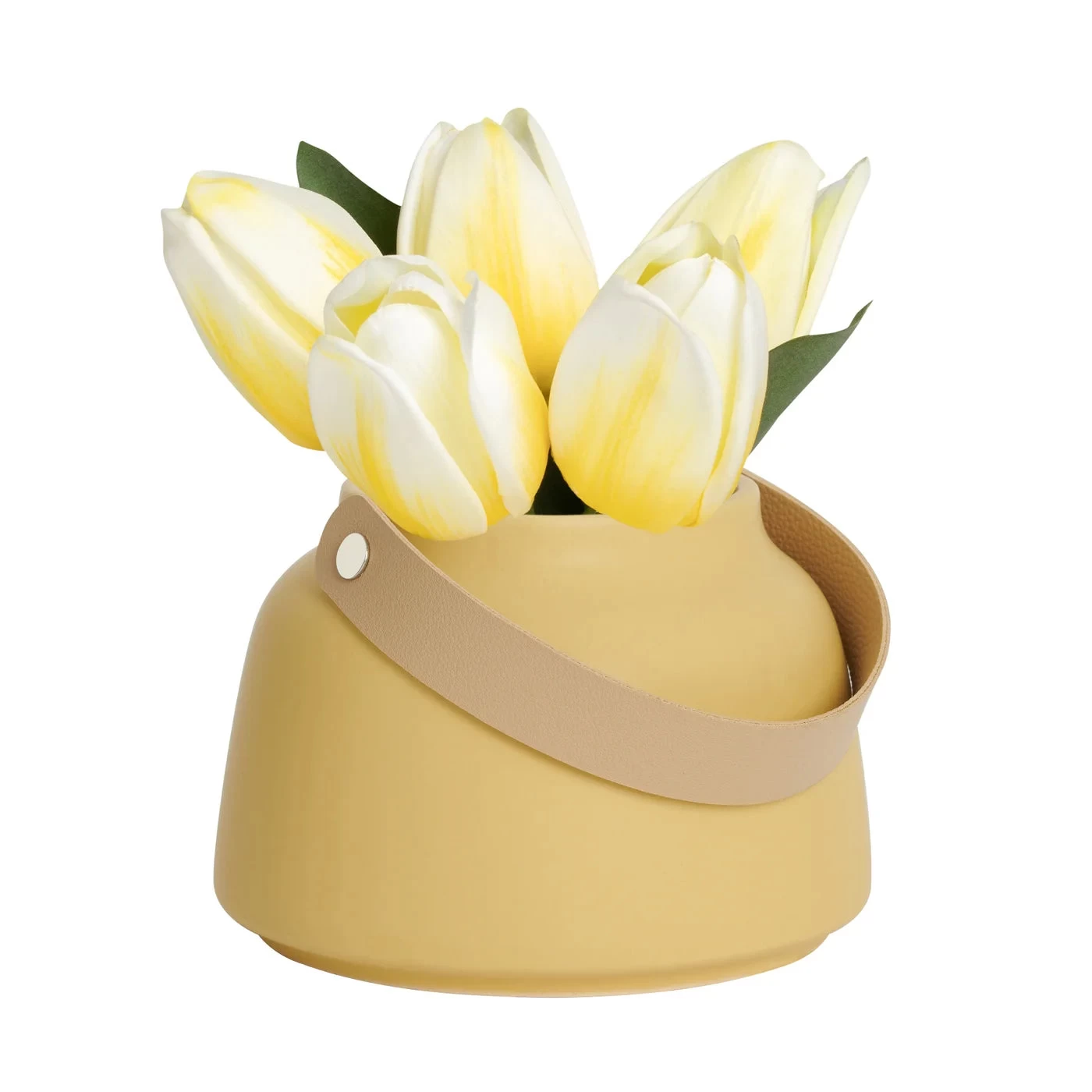 Bring a cozy atmosphere to your space with this Lido Matte Yellow Ceramic 3.5h” Taper Vase with Faux Leather Handle. Its modern matte finish and playful faux leather handle lend an elegant aesthetic, while its size allows you to create a unique visual display with mix-and-match colors and sizes. Elevate your decor with this stylish, tasteful accent.