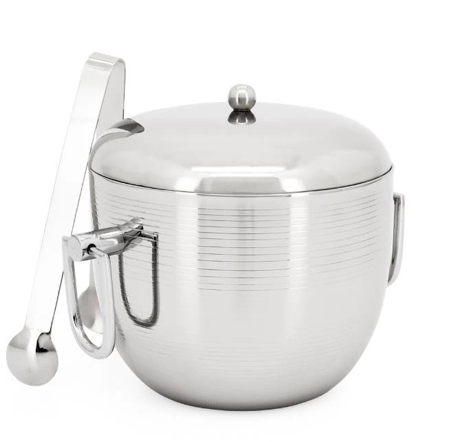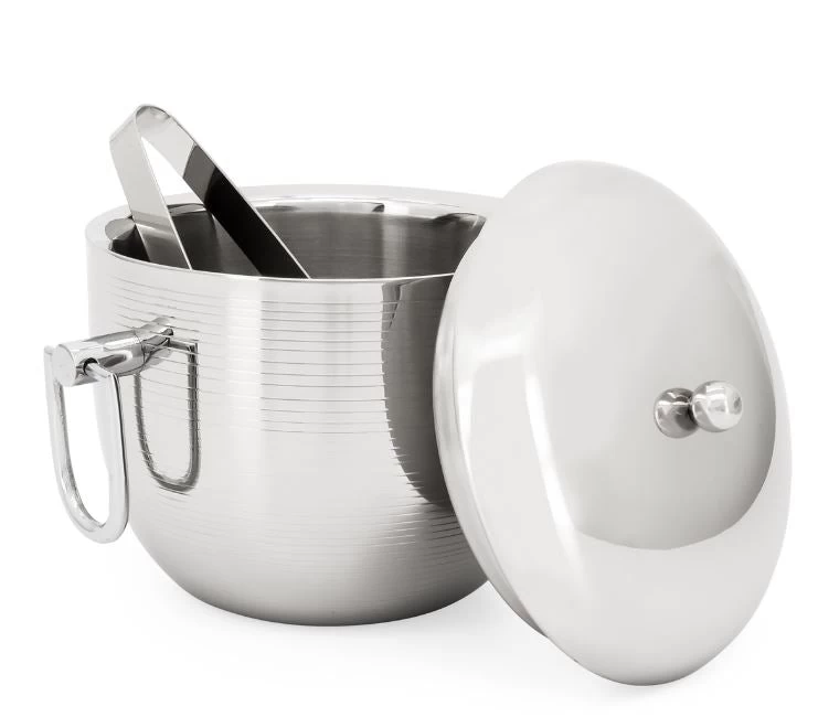 An essential for entertaining, this stainless steel ice bucket and tongs set feature a stylish linear design.