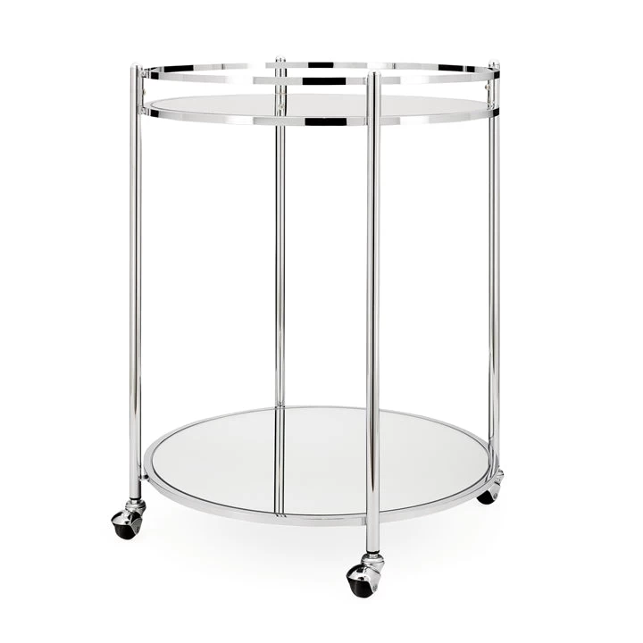 The Manhattan 2 Tier Mirror Glass Serving Trolley features a sleek design composed of chrome plated steel and glass.Â