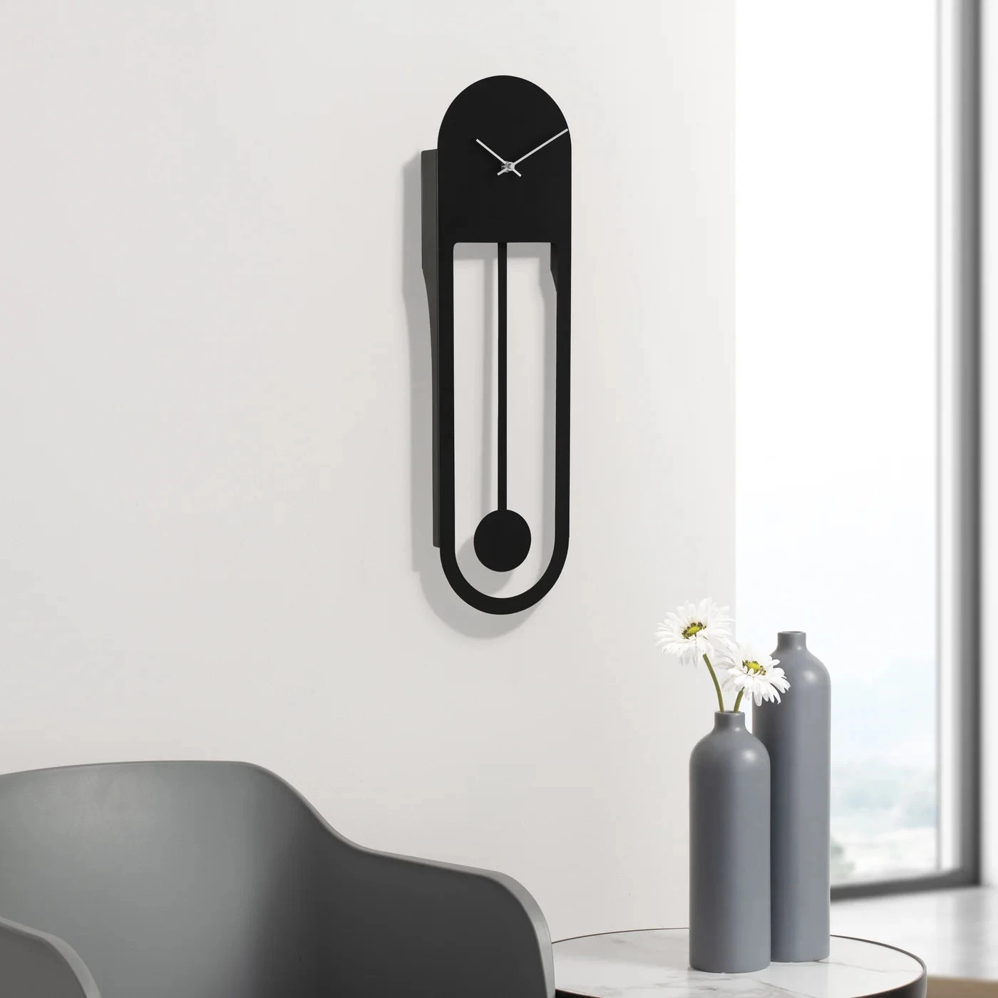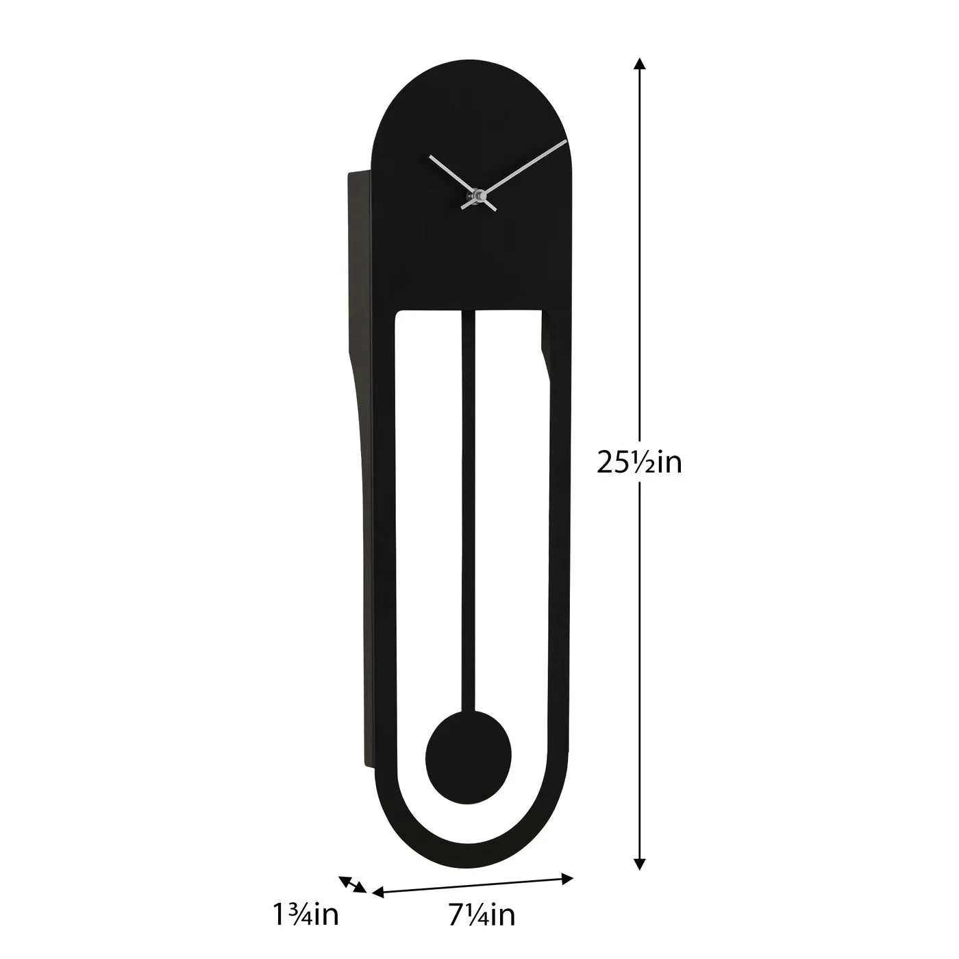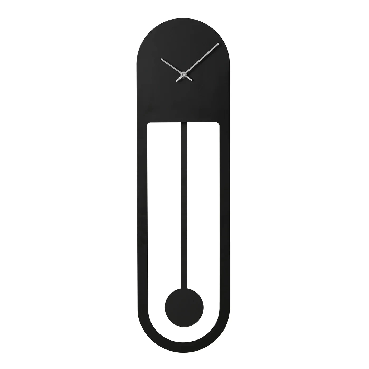Perfect for the home or office, this contemporary black metal wall clock features a modern oval shape and swinging pendulum.