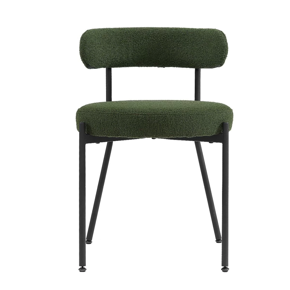 Relax in elegance with the Molly Dining Chair. Crafted from durable black powder coated metal and sumptuously upholstered in luxurious green boucle fabric, this chair will bring a touch of sophistication to your dining space. Curved edges and plush foam padding make for a comfortable dining experience and complete the look of refinement.
