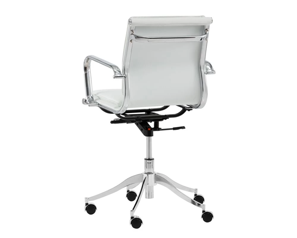 This office chair from our Urban Unity collection sits comfortably with a padded seat and back in a onyx, tan and snow faux leather. Finished with a stainless steel frame and castors for mobility.