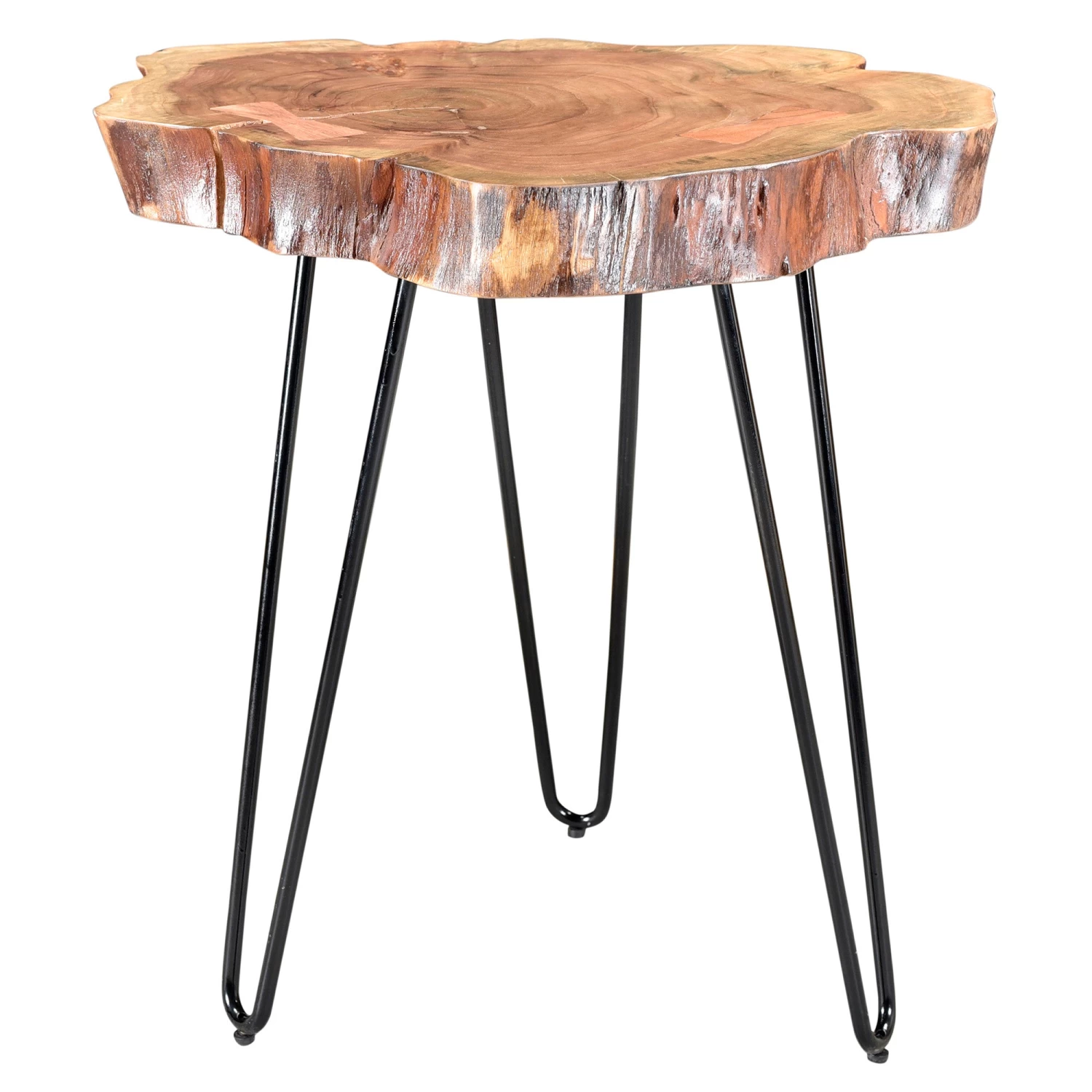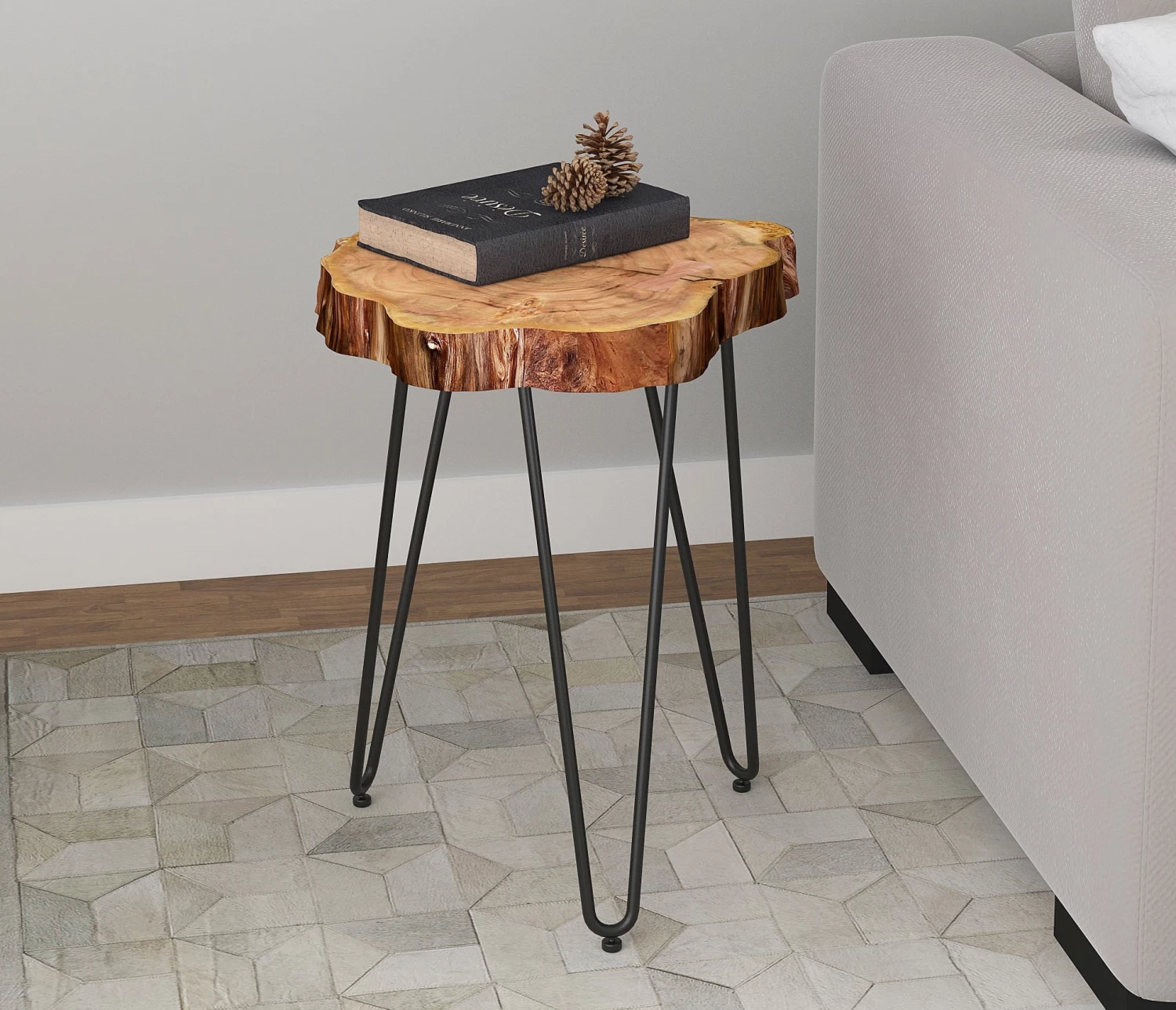 Finding the perfect middle ground between rustic charm and contemporary chic, this accent table has all of the elements to be as trendy as it is timeless. Artisan crafted out of organic and sustainable materials making every one its own one-of a-kind treasure, this table’s design adapts to the pieces it’s styled with. Modern influence is displayed through its minimalistic hairpin legs providing stability, a sleek appearance, functional use, and a simple yet artistic flair. This unique and gorgeous accent table is built for both form and function, giving it a longevity that is unparalleled. Perfect for loft-style living rooms or country kitchen-diners.