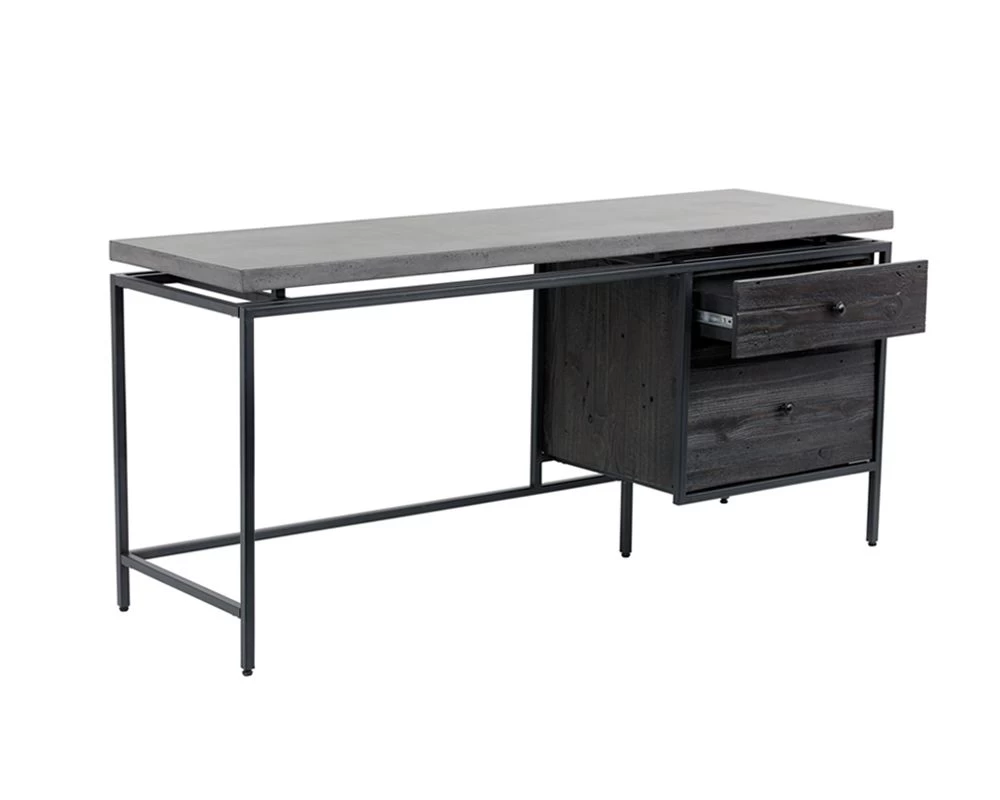 Concrete, wood and metal come together to construct a fascinating desk from our MIXT collection. Featuring a thick grey concrete top, a black metal frame and pine wood drawers in a coffee bean finish.
