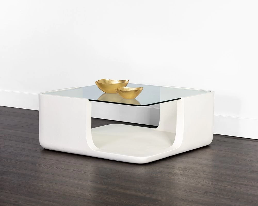 This modern coffee table will draw intrigue through any space. Features a white concrete base and a clear glass top. Suitable for indoor and covered outdoor spaces. Crafted from a natural concrete mix, each piece will look different, with variations of white hues that will enhance over time. Coordinating end table also available.