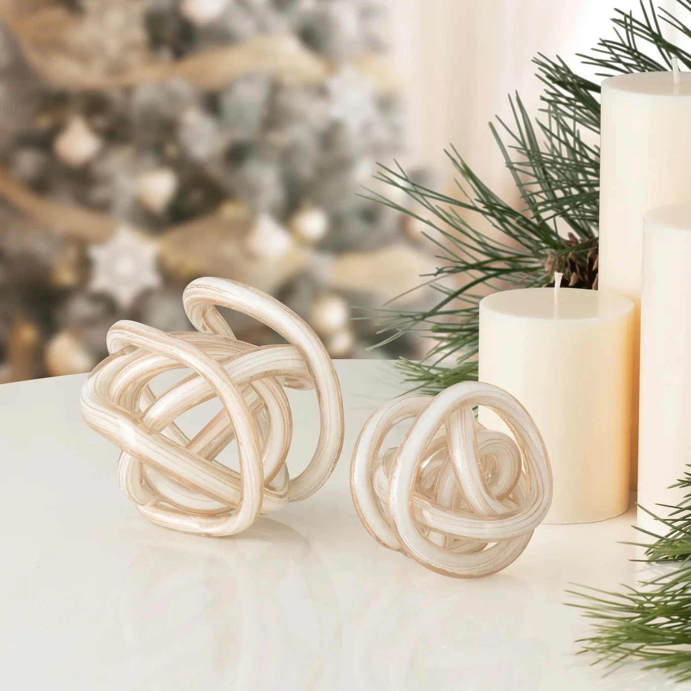 This Orbit Glass Knot Decor Ball brings elegance and sophistication to any space. Its mesmerizing swirl of gold and white glass creates a striking sculptural statement, perfect for a luxurious statement piece, display bowl filler, or desk accessory. Let its artistic aura bring an air of refinement to your home.