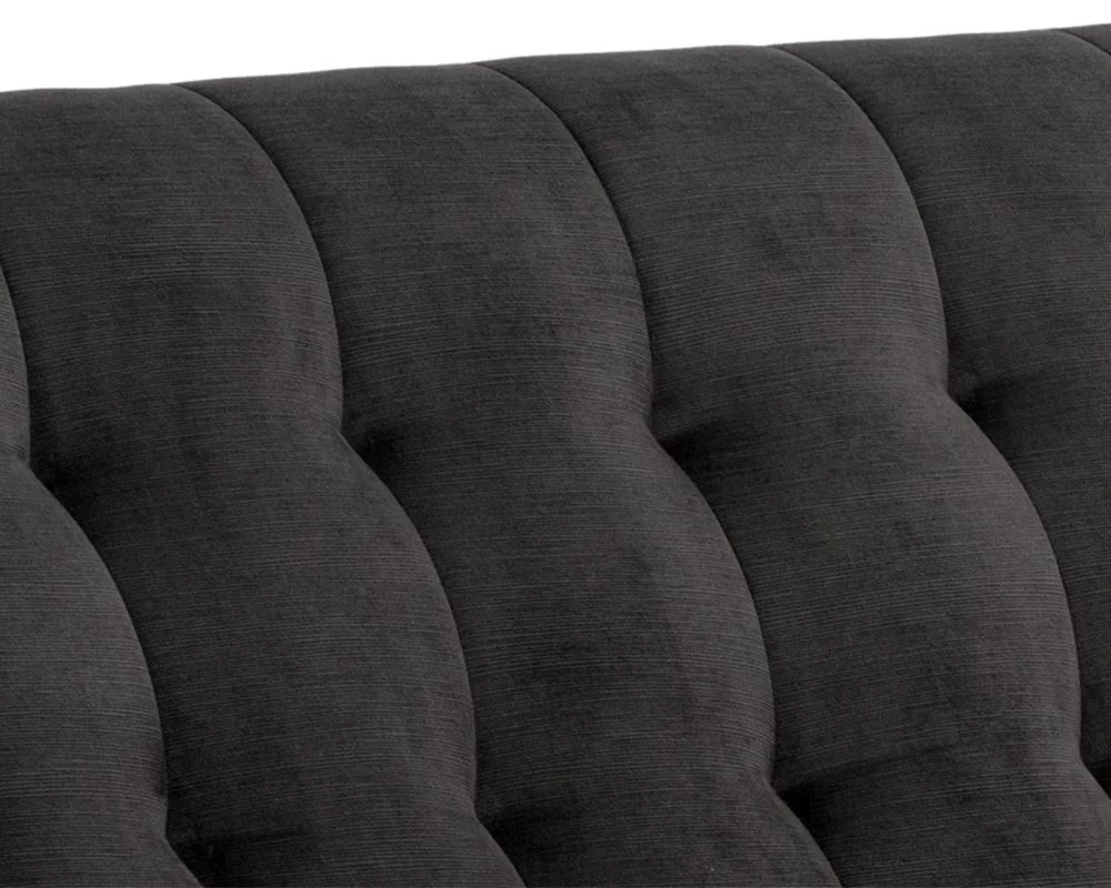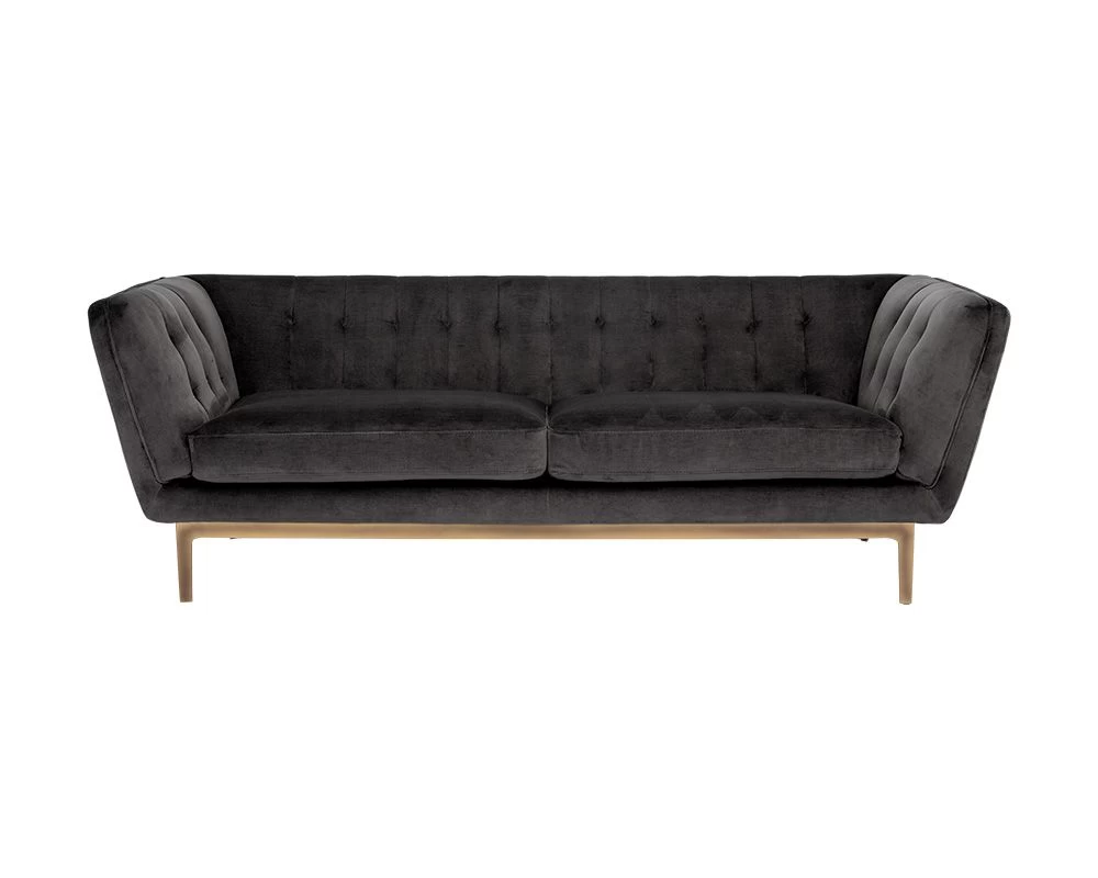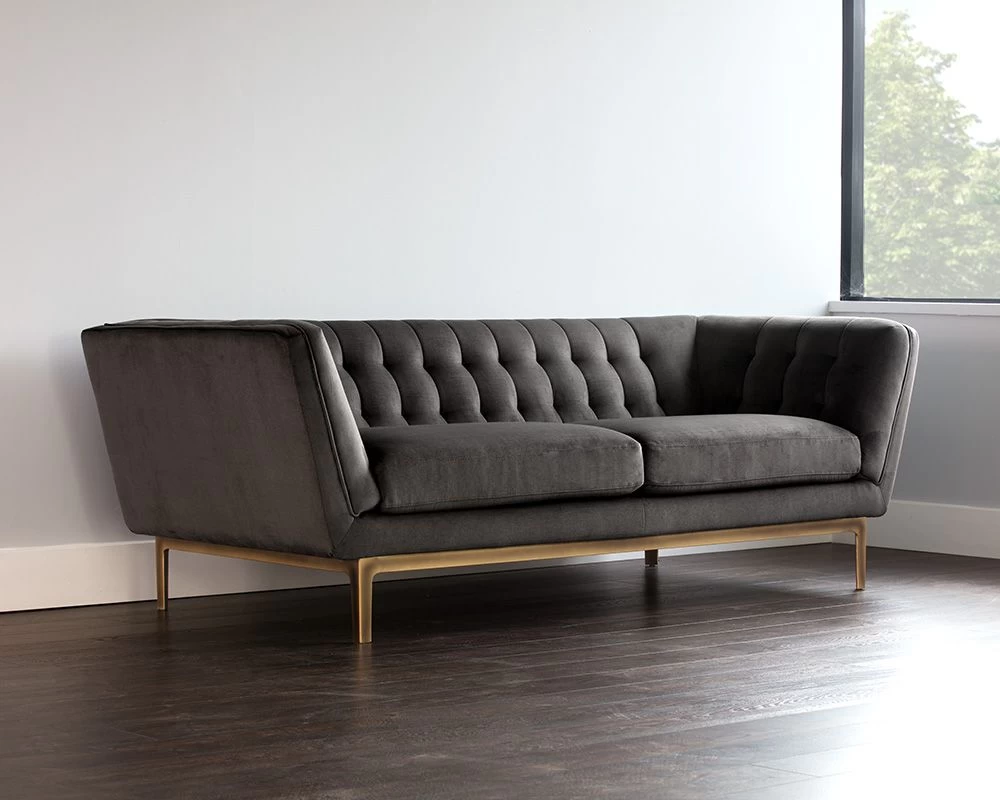 A charming sofa designed with mid-century modern style. Features tufting on the seatback and finished with a rustic bronze frame. Comes with two cushions for added comfort.