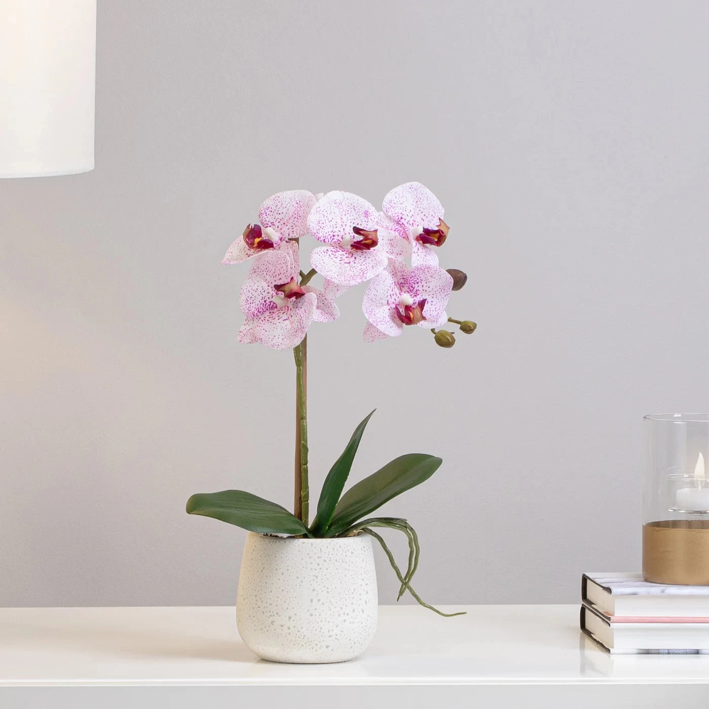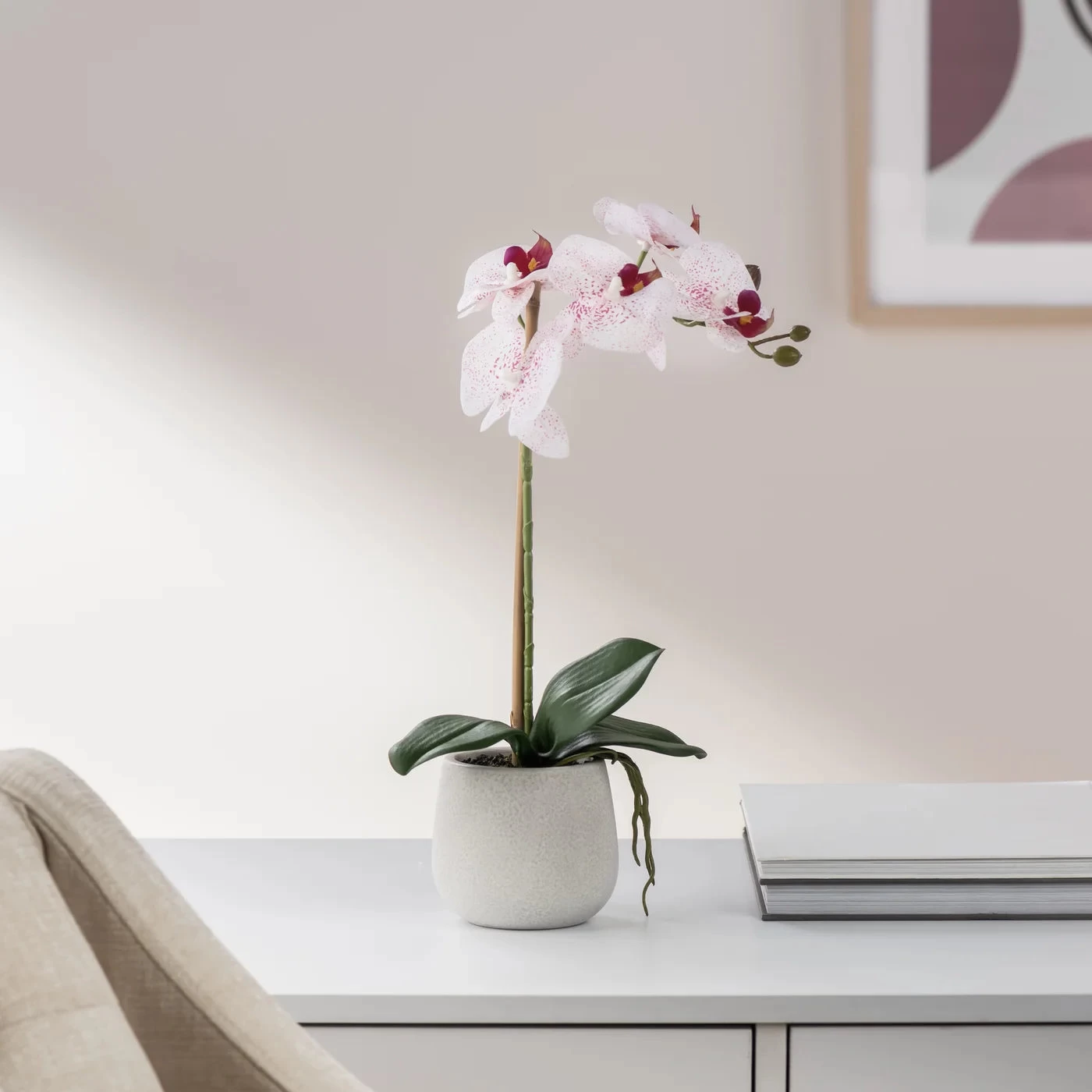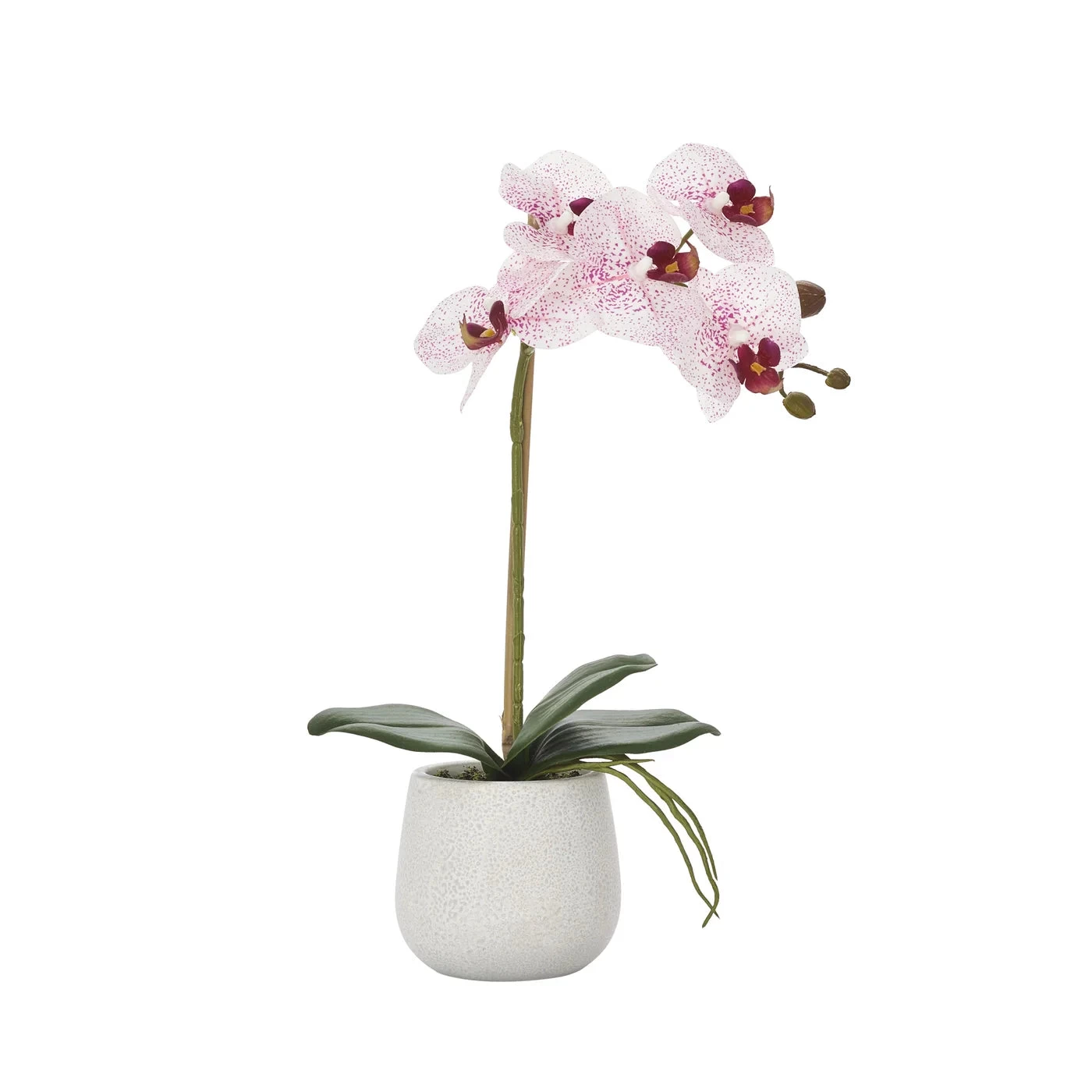 Bring a touch of modern luxury to any space with this handcrafted faux Phalaenopsis Orchid plant. With exquisite attention to detail, the lifelike pink blooms add a spa-like ambience to your home or office. Stylishly presented in a ceramic pot, this easy-care piece brings an elegant and tasteful feel to any decor.