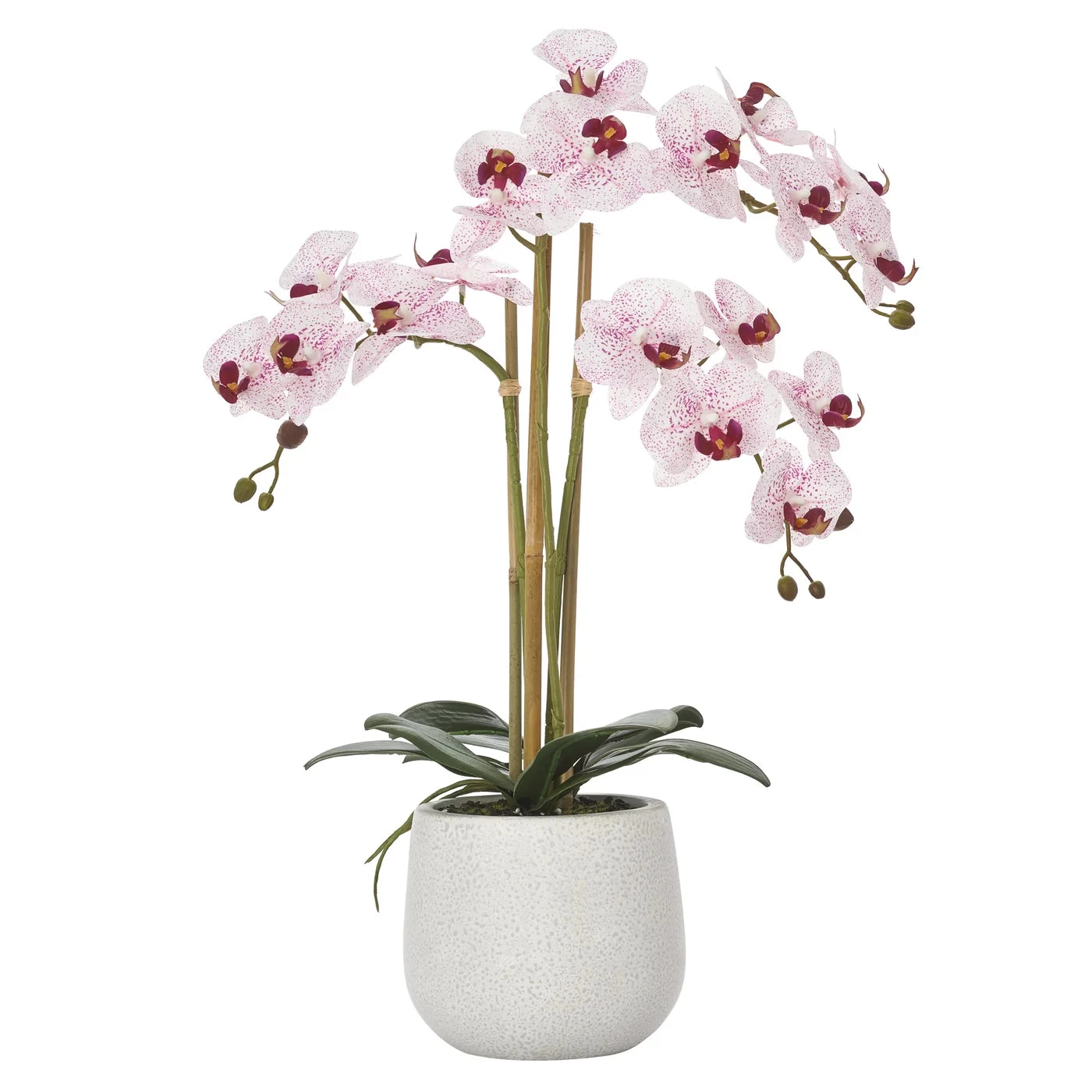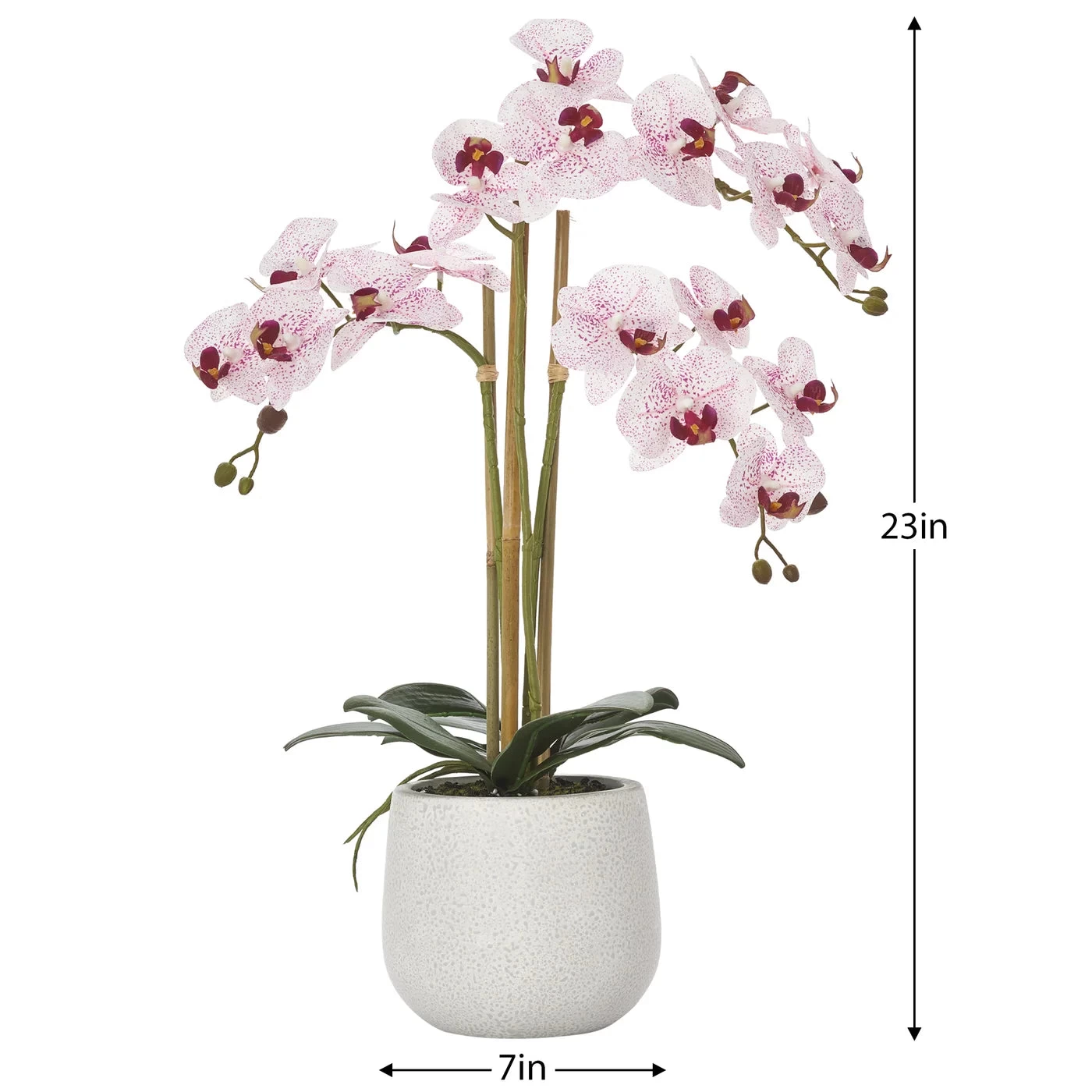 Bring beauty and sophistication to your home with this delightful faux Phalaenopsis Orchid. This handcrafted triple stem orchid features realistic pink flowers and is designed to bring a modern spa experience to any room it occupies. Finished with a modern ceramic pot, this delightful faux orchid is the perfect way to add an air of exclusivity to your decor.