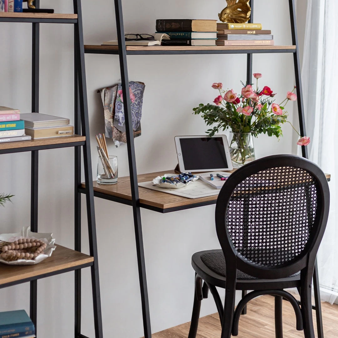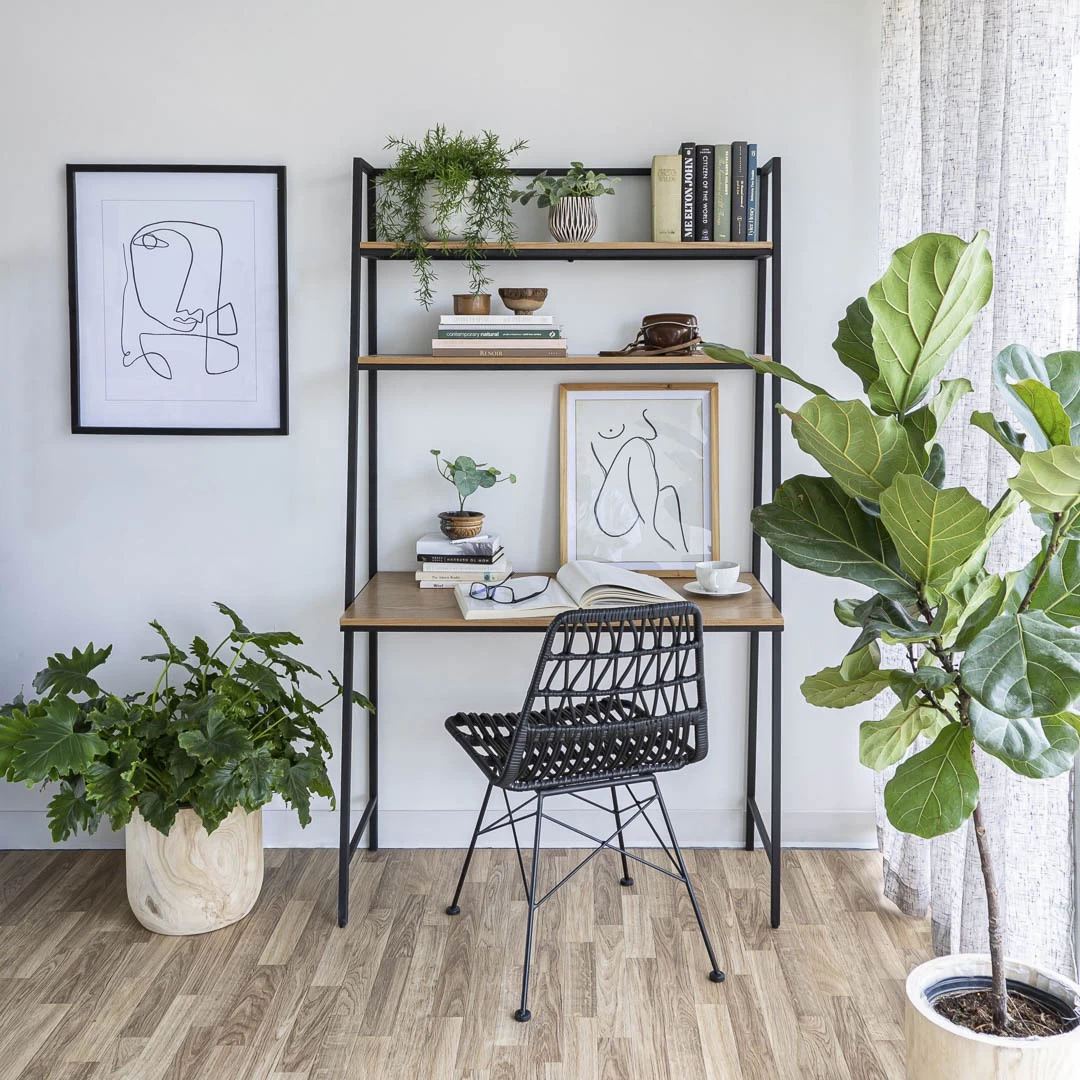 If you are looking for a unique desk with incredible style, Prince was made just for you. This mid-mod-inspired free-standing desk and shelf combo features a black OR white metal frame with ample desktop and two natural ash wood shelves. The stepped-back design gives you plenty of space for your work things and pretty things too. Create a whole unit when you combine with our Prince Shelves.
