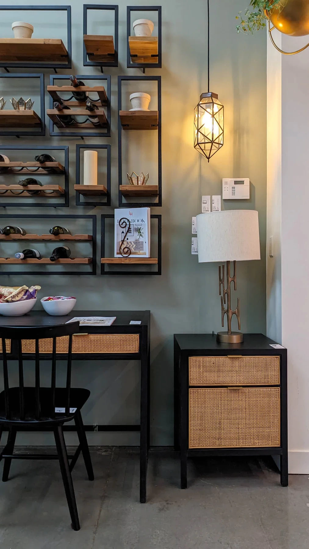 - Wicker accents on the drawers add style and colour