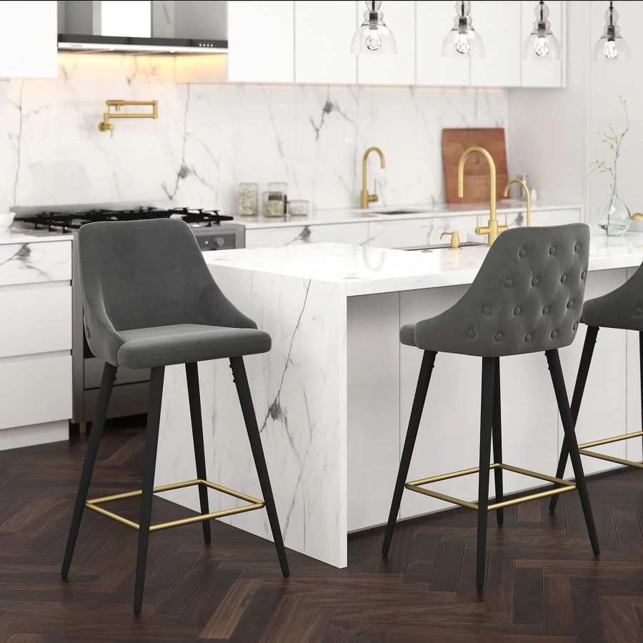 Style and comfort combine in full force with this modern counter stool. Added design details like the button tufting on the seat back and the gold-finished footrest elevate this stool to the next style dimension. The 26″ seat height is perfect for kitchen or bar counters. Bring a fun and contemporary pop of colour to create a formal or casual experience.