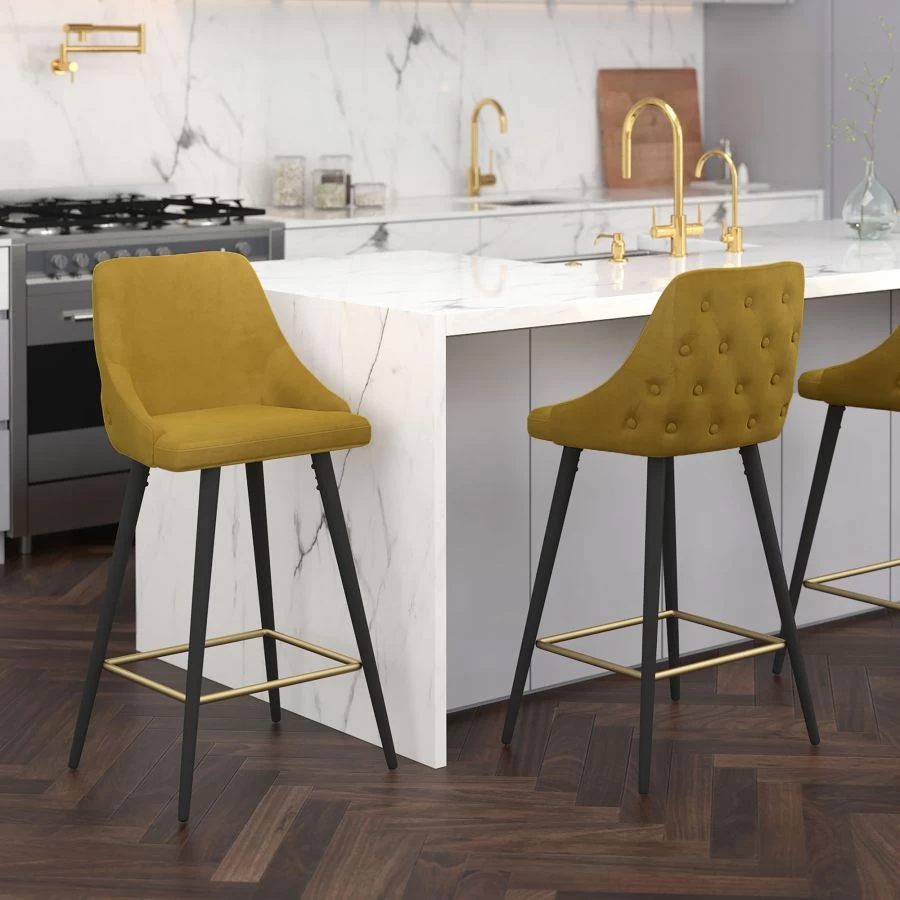 Style and comfort combine in full force with this modern counter stool. Added design details like the button tufting on the seat back and the gold-finished footrest elevate this stool to the next style dimension. The 26″ seat height is perfect for kitchen or bar counters. Bring a fun and contemporary pop of colour to create a formal or casual experience.Â