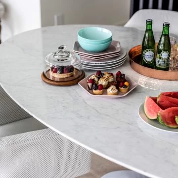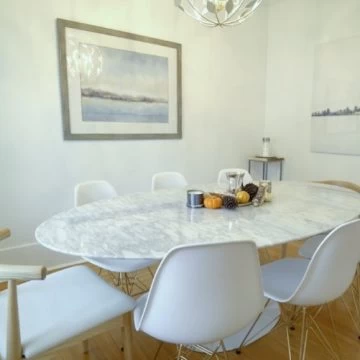 Our Saarinen dining tables are made with unfinished, pristine Tuscan white Carrara marble. Featuring deep grey-blue veins with heavy cast aluminum powder coated bases, these classic mid-century modern tables are the ultimate elegant table.Â