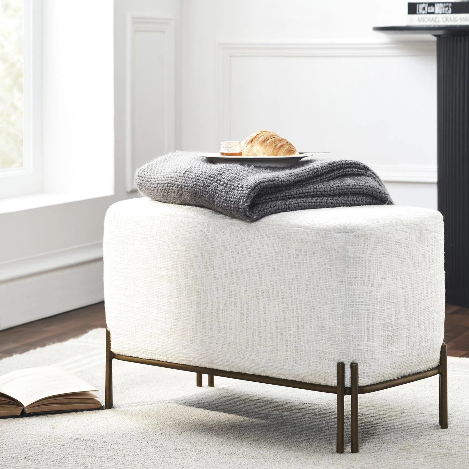 Welcome guests with warm elegance when you place the Sakura Bench in your entryway. Crafted from durable iron, this antique brass-finished bench is designed to make a bold statement while also providing comfortable seating, thanks to its soft cotton tweed upholstering and foam filling. Make your entryway look and feel like a luxurious sanctuary.