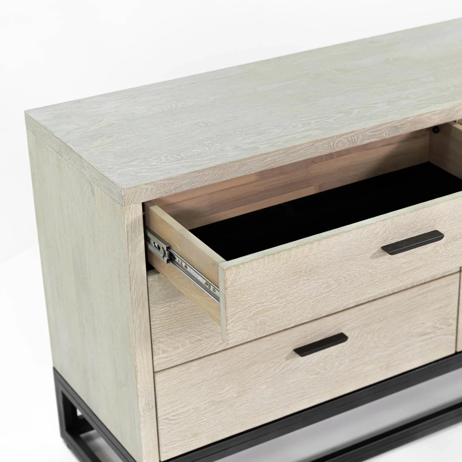 | Other Details | Solid White Oak: top, side panels, drawer front MDF Oak Veneer: bottom/back drawer Metal: legs Felt Lined top drawers: Yes Removable Legs: No Finished Back: No (Plywood) Type of wood Joinery: Basic Butt |