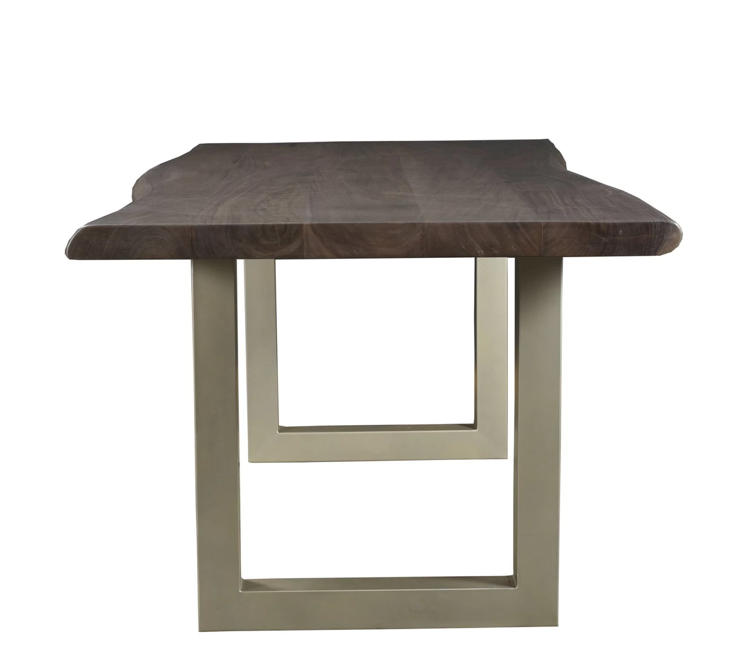 The Taj Dining Table features a live edge solid acacia wood top with an acrylic matte wood finish. Seats up to 6 people comfortably.