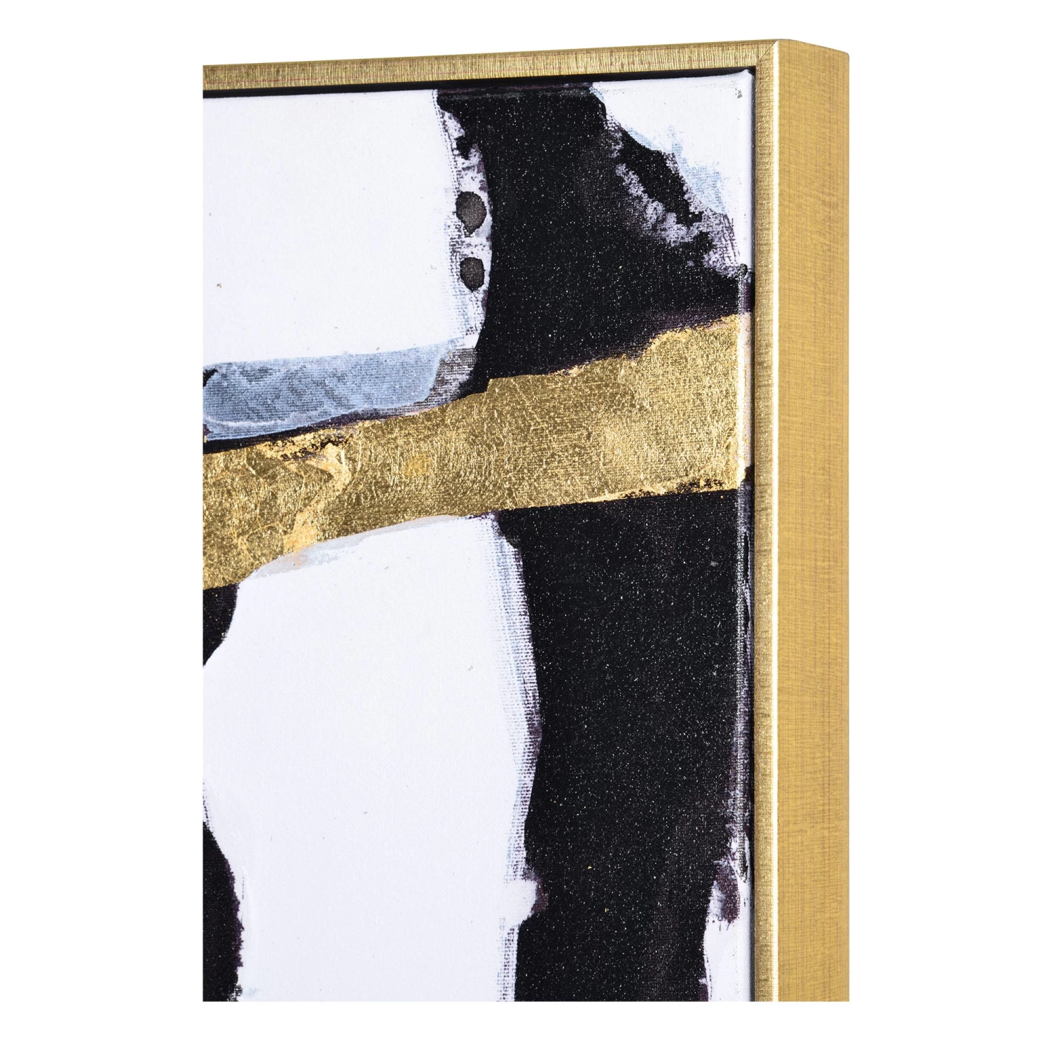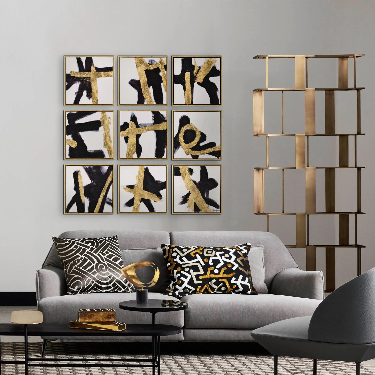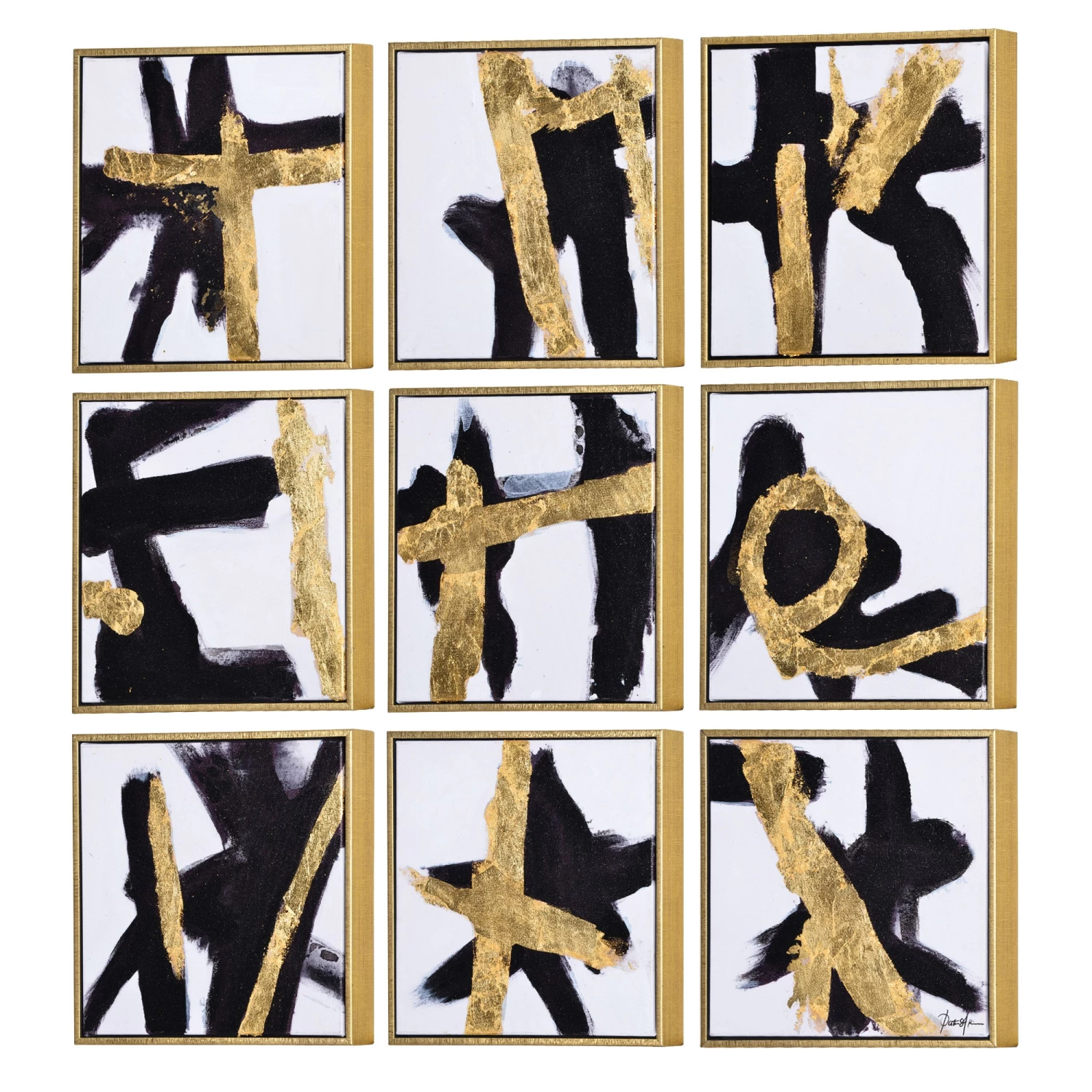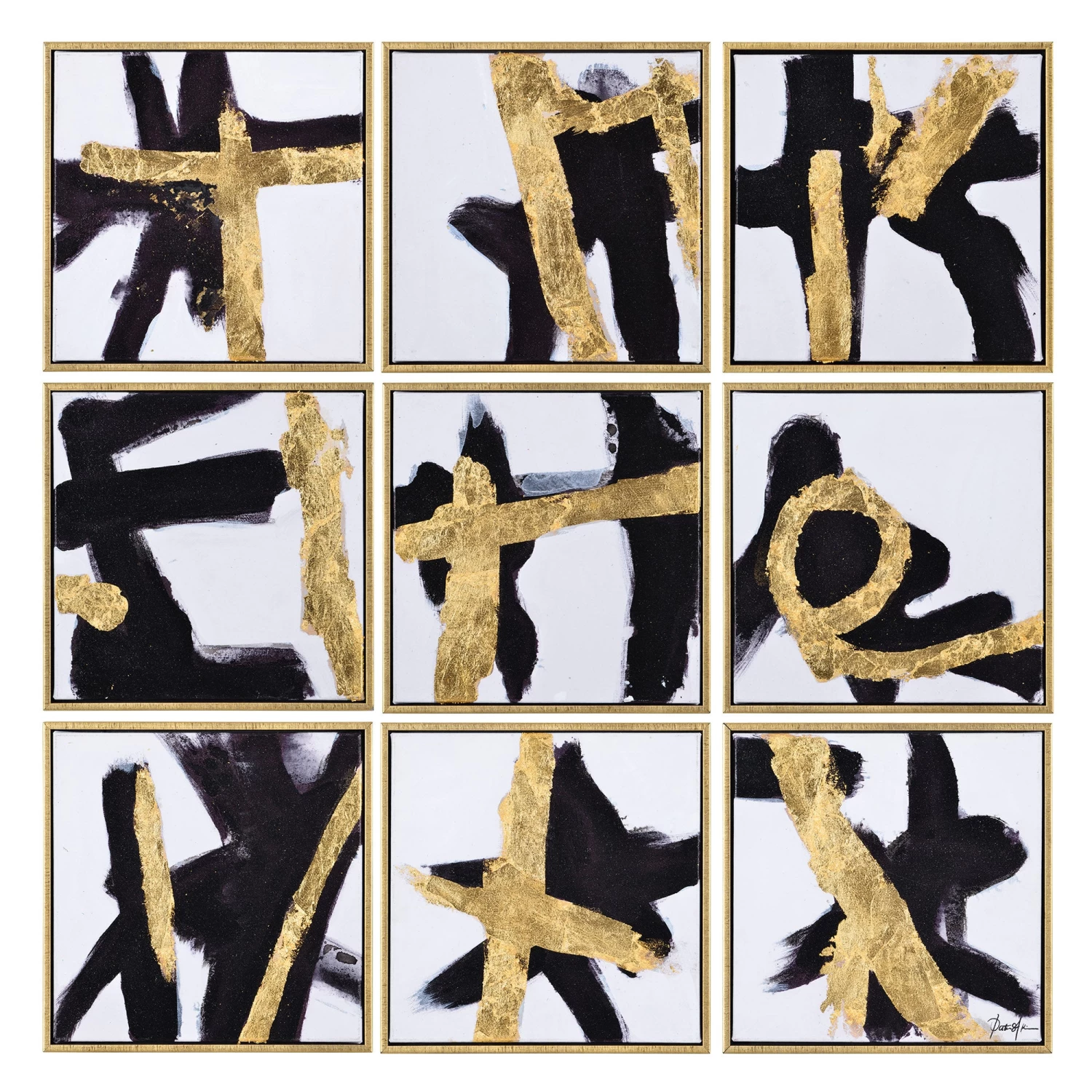 The Traces Canvas Painting features a set of nine canvas paintings, each with gold leaf accents and gold leaf, floating wood frames.Â
