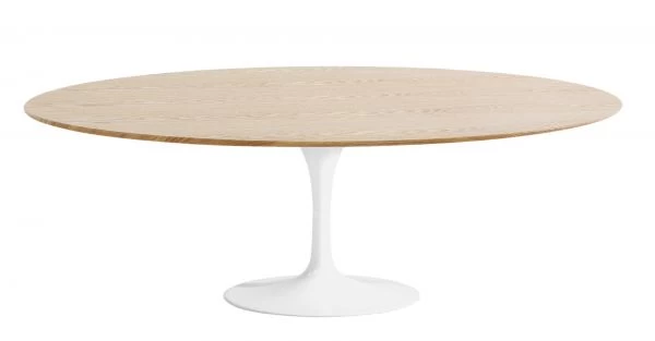The Trumpet Oval Wooden Dining Table is made of an Ash Wood Veneer Finished Dining Top and White Coated Aluminum Base. Seats up to 6 people comfortably.