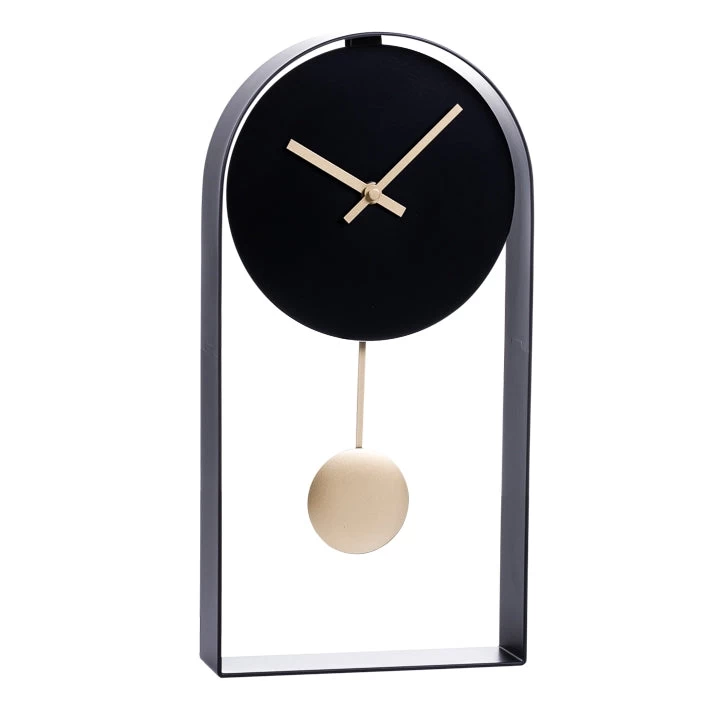 This contemporary clock features a contrasting pendulum and hands making it a standout piece for either the wall or a desk or shelf.