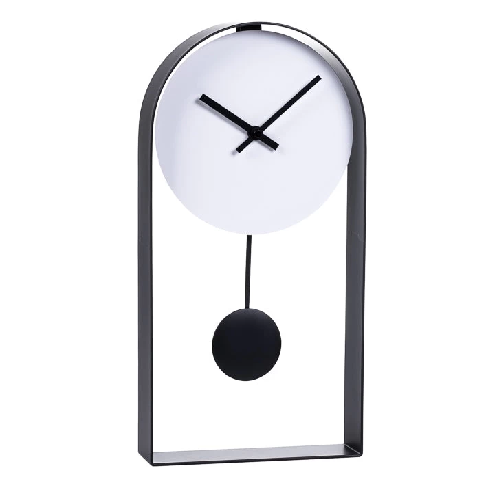 This contemporary clock features a contrasting pendulum and hands making it a standout piece for either the wall or a desk or shelf.