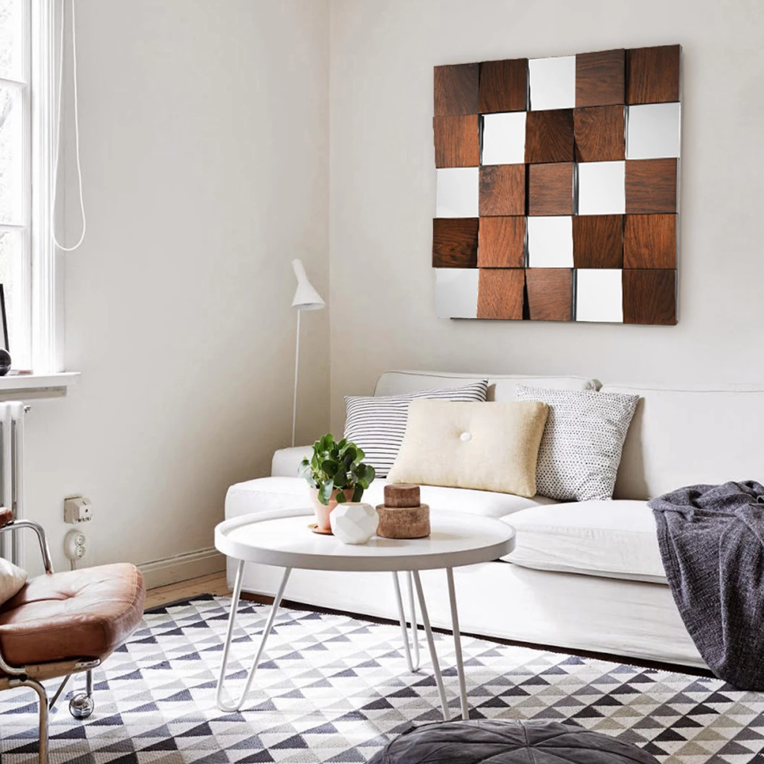 The Westside Wall Mirror features a multi-level wood design with a walnut finish.Â