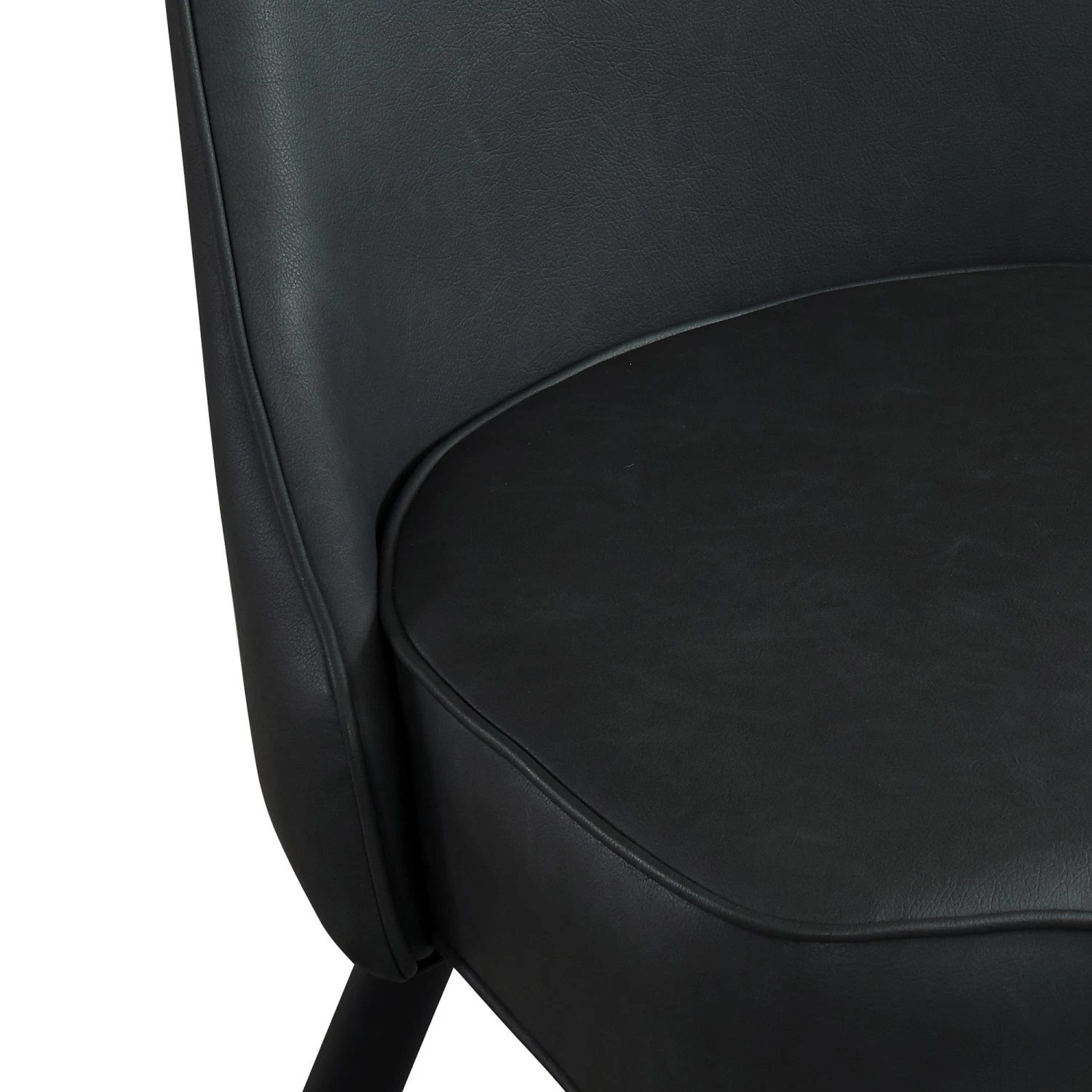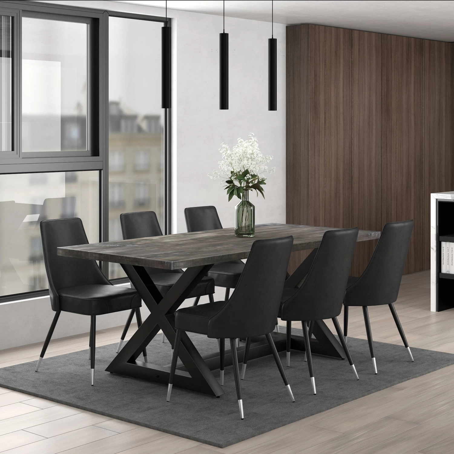 A sturdy base of this dining table supports a solid table top that will command the attention of guests as they marvel at the appearance of the handsome wood grain This oversized mid-century dining chair will bring warmth and comfort to any casual or formal dining space. The plush cushions are finished with piping details on the front and back, while the black metal legs are topped (bottomed?) with a chrome accent. The vintage-look faux leather upholstery gives off a rustic vibe while the chrome adds a contemporary touch.