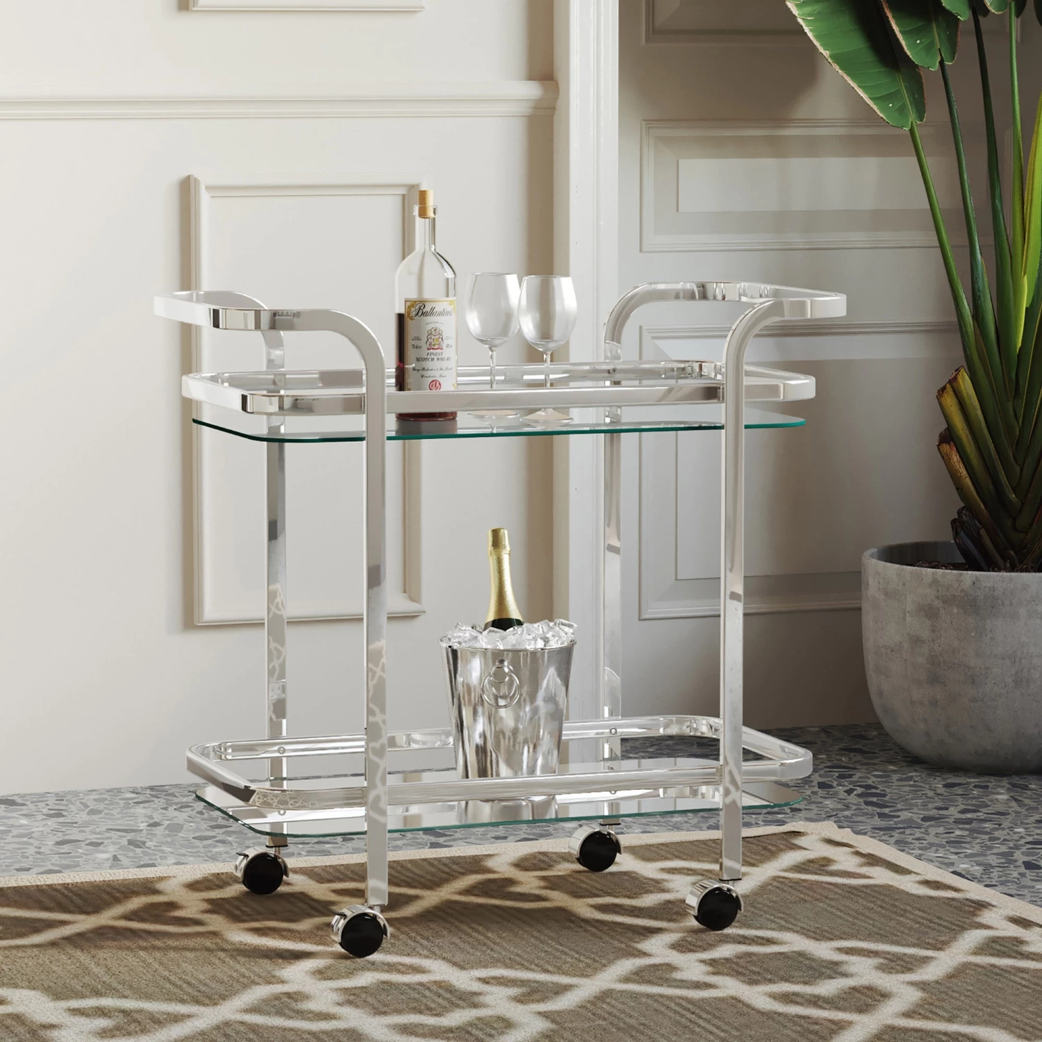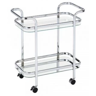 This 2-tier trolley is a functional furnishing with an edgy twist. Designed in a contemporary fashion, this chrome-finished piece has a top shelf that is outfitted with a 5mm-thick clear tempered glass shelf and a bottom shelf that has a 5mm-thick mirrored glass bottom shelf. The incorporation of two varying shelf types allows you to see every facet of this trolley through its top while its mirrored bottom reflects giving the illusion of a larger, grander space. With plastic wheels that rotate 360 degrees allowing for full maneuverability and have a locking capability, this versatile trolley can be showcased from every angle. Whether you’re serving up the cocktail of the hour or hors d’oeuvres fresh out of the oven, this trolley will be the highlight of the night.