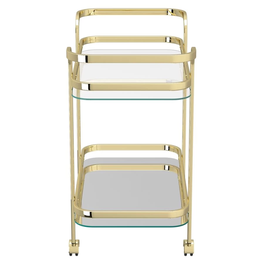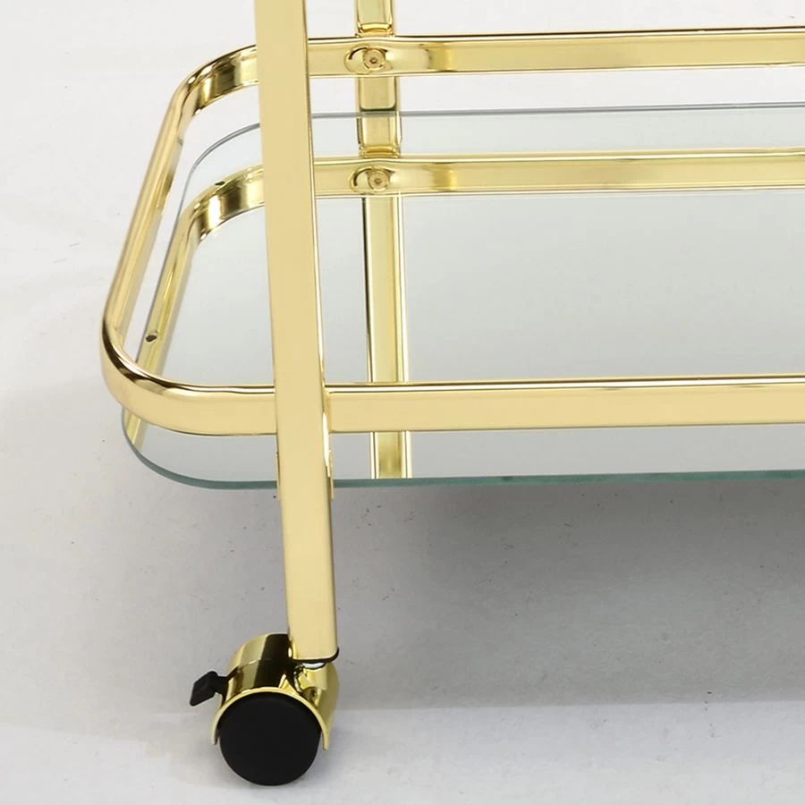 This 2-tier trolley is a functional furnishing with an edgy twist. Designed in a contemporary fashion, this chrome-finished piece has a top shelf that is outfitted with a 5mm-thick clear tempered glass shelf and a bottom shelf that has a 5mm-thick mirrored glass bottom shelf. The incorporation of two varying shelf types allows you to see every facet of this trolley through its top while its mirrored bottom reflects giving the illusion of a larger, grander space. With plastic wheels that rotate 360 degrees allowing for full maneuverability and have a locking capability, this versatile trolley can be showcased from every angle. Whether you’re serving up the cocktail of the hour or hors d’oeuvres fresh out of the oven, this trolley will be the highlight of the night.
